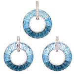 Immerse yourself in the tranquil beauty of the 18K Circle Blue Topaz Diamond Set, a breathtaking fusion of elegance and brilliance. Expertly crafted in luxurious 18-karat white gold, this radiant ensemble showcases a stunning circular design, adorned with channel-set blue topaz gemstones that exude serenity and sophistication. Each piece in this exquisite set features vivid blue topaz gemstones, their cool, calming hues reminiscent of crystal-clear waters. The seamless channel setting enhances the gemstones brilliance, allowing them to flow effortlessly in a harmonious circle of color. Encircling the gemstones, pavé-set diamonds shimmer like stardust, delicately accentuating the design with a celestial glow. The perfect interplay of sparkling diamonds and luminous blue topaz makes this set a true statement of grace and refinement. A stunning addition to your jewelry collection or a meaningful gift for a loved one, this set is designed to dazzle and enchant with every wear.