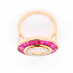 Indulge in the opulence of Art Deco charm with this 18K Gold Circle Ruby Ring—a true masterpiece of sophistication and craftsmanship. Featuring meticulously tapered baguette-cut rubies, hand-selected from Mozambique, this ring radiates an intense pinkish-red hue, symbolizing passion and luxury. The gemstones are seamlessly channel-set, creating a flawless, continuous flow of brilliance. Encircling the rich rubies, a dazzling pavé-set diamond inner circle enhances the ring’s luminous allure, adding a touch of celestial sparkle. The diamonds’ brilliance beautifully contrasts against the deep red rubies, creating an exquisite balance of fire and light. A perfect fusion of heritage and modernity, this piece embodies the grandeur of the Roaring Twenties with a contemporary twist. Let it take center stage and captivate with its extraordinary beauty and radiant diamonds.