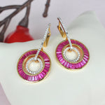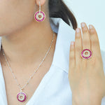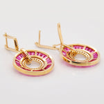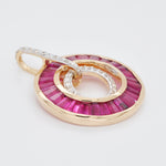 Experience timeless elegance and bold sophistication with this exquisite 18K Gold Ruby Circle Set, featuring a matching pendant and dangle earrings. Inspired by the striking geometry of Art Deco design, each piece showcases meticulously calibre-cut tapered baguette rubies, known for their vivid pinkish-red hue and radiant brilliance. The rubies are seamlessly set in a circular channel, surrounded by pavé-set diamonds that enhance their fiery glow and create a mesmerizing interplay of light. The pendant dazzles with a graceful drop framed in a diamond-studded ring, while the earrings mirror the same luxurious motif, suspended from sleek diamond-studded linear tops for added elegance and movement. Crafted in luminous 18K gold, this set is a celebration of fine craftsmanship, color, and timeless artistry — perfect for making a refined statement from day to night.