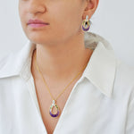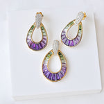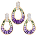 This jewelry set brings together matching doorknocker-style earrings and a pendant in a seamless harmony of vibrant gemstones and luxurious design. Each piece showcases a stunning gradient of tapered baguette-cut amethysts and green tourmalines, expertly channel-set in polished yellow gold. The dynamic flow colour creates an enchanting visual effect, symbolizing creativity. At the top of both the earrings and pendant, pavé-set diamonds add a touch of brilliance, enhancing the overall sophistication of the design. Perfect for adding a colorful statement to evening wear or enhancing everyday elegance, this set is a celebration of bold luxury, refined craftsmanship, and timeless style.
