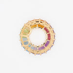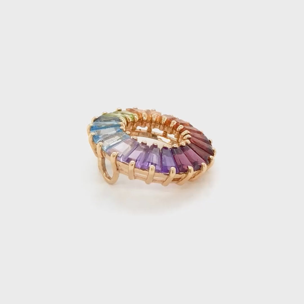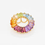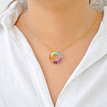 Illuminate your style with the Circle Rainbow Prong Pendant, a dazzling tribute to the beauty of diversity and harmony. Featuring a breathtaking gradient of fiery reds, golden yellows, lush greens, serene blues, and regal violets, each gemstone is meticulously set in lustrous gold prongs, ensuring maximum brilliance from every angle. Crafted with exceptional precision and artistry, this pendant is more than just an accessory—it's a symbol of life’s vibrant tapestry, where each hue tells a story of passion, joy, and elegance. Its versatile design seamlessly transitions from casual outings to formal soirées, making it a timeless addition to any jewelry collection.