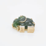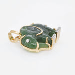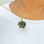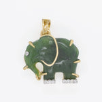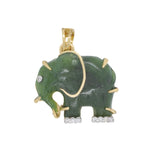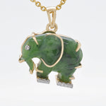 This exquisite 14 Karat Yellow Gold pendant necklace is a remarkable testament to the artistry of fine jewelry, inspired by the grace and symbolism of the elephant. The centerpiece of this unique design is a hand-carved nephrite jade gemstone weighing 11.47 Carats, expertly sculpted into the form of an elephant. The jade's rich green hues bring life and depth to the design, while the intricate carving captures the elephant's majestic presence and gentle spirit.