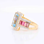 Celebrate love with this elegant 14K gold ring featuring a pastel baguette-cut aquamarine (12 x 6.7 mm) at its center. Flanked by uniquely shaped pink tourmalines in a trapezoid silhouette and accented with pavé-set diamonds on a tapered shank, it blends serene blues, vibrant pinks, and sparkling brilliance—a perfect piece for special moments.