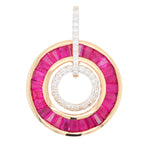 Experience the perfect fusion of Art Deco elegance, vivid color, and cultural richness with this exquisite 18K Gold Circle Ruby Tapered Baguette Pendant. Designed to captivate, this masterpiece embodies passion with its sumptuous Mozambique rubies, meticulously hand-picked for their radiant pinkish-red hue, exceptional transparency, and unparalleled brilliance.Each ruby is calibre-cut by master artisans, ensuring a seamless tapered baguette arrangement that enhances their fire and vibrancy. Encased in a pavé-set diamond dangling ring, this pendant radiates an ethereal glow, elevating its sophistication and timeless charm. The geometric precision and symmetrical beauty of Art Deco design shine through, making this piece a statement of refined luxury.