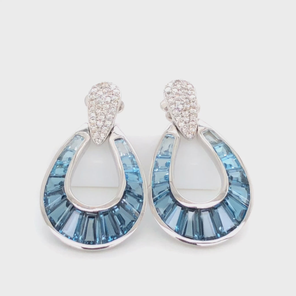 Introducing 14K gold gradient blue topaz doorknocker earrings—a fusion of elegance and brilliance. Crafted with precision, the teardrop silhouette boasts a mesmerizing dangle, featuring a pear-shaped top adorned with sparkling diamonds. The suspended pear shape reveals a stunning gradient of London Blue, Swiss Blue, and Sky Blue topaz, creating an enchanting visual symphony. Perfect for luxurious occasions, these earrings embody opulence, artistry, and timeless beauty.