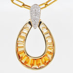 Make a bold statement with this luxurious 14K Gold Doorknocker Citrine Pendant. The elegant drop-shaped pendant features a captivating doorknocker design, showcasing a seamless gradient of vibrant, caliber-cut stones in a sleek channel setting. A brilliant pear-shaped diamond setting adds an eye-catching sparkle, while the graceful drop shape enhances its fluidity and charm. Crafted with exceptional artistry, this necklace exudes opulence, elegance, and individuality.