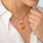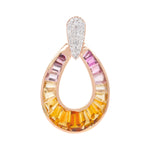 Make a bold statement with this luxurious 14K Gold Doorknocker Citrine Pink Tourmaline Pendant. The elegant drop-shaped pendant features a captivating doorknocker design, showcasing a seamless gradient of vibrant, caliber-cut stones in a sleek channel setting. A brilliant pear-shaped diamond setting adds an eye-catching sparkle, while the graceful drop shape enhances its fluidity and charm. Crafted with exceptional artistry, this necklace exudes opulence, elegance, and individuality.