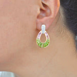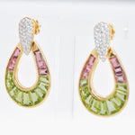 Indulge in the mesmerizing splendor of 14K gold Peridot Pink Tourmaline Doorknocker Earrings, a timeless epitome of elegance. Meticulously crafted, these tear-drop design earrings ensure an elegant dangle, with diamond-studded pear shapes gracing the ears. Clear, lustrous peridots and pink tourmalines create a breathtaking ombré effect, ideal for any evening ensemble. Whether at a grand gala or a sophisticated gathering, these earrings elevate your style, leaving an indelible impression of opulence and refinement. Surrender to the enchantment of these earrings, letting their radiant charm illuminate your every moment.