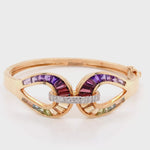 Experience the allure of 14K Gold Doorknocker Rainbow Bracelet, where bold design meets exquisite craftsmanship. This captivating piece features 30 hand-picked, caliber-cut gemstones that create a stunning rainbow effect, beautifully accented with pavé-set diamonds for added brilliance. The unique doorknocker design and vibrant gemstone arrangement make this bracelet a true work of art, perfect for adding a touch of luxury and elegance to any occasion.