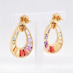 Dazzle in sophistication with stunning rainbow doorknocker earrings, featuring calibre-cut channel-set gemstones in a vibrant cascade. Adorned with a diamond-studded pear top, these luxury statement earrings showcase Garnet, Rhodolite, Peridot, Citrine, Amethyst, Topaz, and Tourmaline, exuding brilliance and sophistication. Expert craftsmanship and unique goldwork make them the perfect blend of color, artistry, and timeless beauty. Elevate any look with these bold and breathtaking gemstone earrings—a true celebration of individuality.