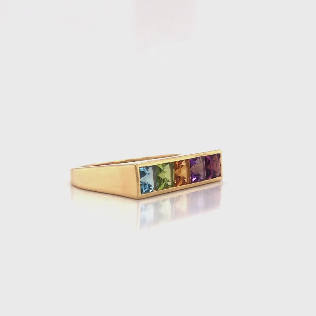 Celebrate color in style with the 14K Gold Linear Rainbow Ring — a radiant expression of individuality and elegance. This modern statement piece features a sleek bar design, adorned with handpicked square-cut gemstones in a mesmerizing rainbow of hues. From passionate reds to tranquil blues, each gemstone is channel-set with precision, creating a seamless spectrum of color that catches the light with every movement. The clean lines and vivid palette offer a perfect balance of luxury and playfulness. Expertly crafted in 14K gold, this ring embodies exceptional craftsmanship and timeless appeal.