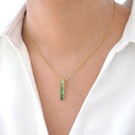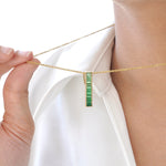 Discover the refined brilliance of the 18K Gold Linear Tsavorite Pendant – a modern tribute to nature’s lush elegance. Featuring baguette-cut tsavorite gemstones in a sleek channel setting, it radiates rich green hues reminiscent of an evergreen forest. With its clean, minimalist silhouette, this pendant effortlessly complements both casual looks and formal ensembles. A fresh pop of color and timeless charm, it's more than an accessory – it’s a statement of natural beauty and contemporary style.