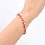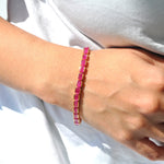 Immerse yourself in the rich elegance of this 18K Gold Tennis Bracelet - Ruby Octagon Edition, featuring 28 identical octagon step-cut rubies, each measuring 6x4mm and totaling 16.65 carats. Set in sleek half-bezel channels, these vivid red rubies radiate fiery brilliance and timeless charm. Expertly crafted with flexible back-linking and a secure double-clasp lock, the bracelet offers both comfort and sophistication. The deep red hue and exceptional luster of the rubies make this piece an irresistible symbol of luxury—perfect for everyday elegance or special occasions. A true celebration of enduring beauty and unforgettable moments.