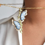 This magnificent 14K Gold Butterfly Pendant brings nature to life with unmatched artistry. It features a 16.82 CT hand-carved blue Agate butterfly, intricately detailed with brilliant diamonds. The design is elegantly framed by vivid green, tapered baguette-cut Peridot, creating a striking composition of color and brilliance. More than jewelry, this 62mm pendant is a unique piece of wearable art.