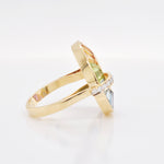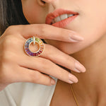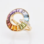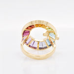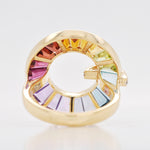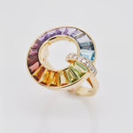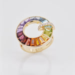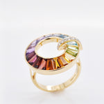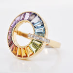 Circle Rainbow Diamond Ring in 14K Gold — a vibrant statement of luxury and individuality. Featuring a sleek circular band, this ring showcases a seamless channel of tapered Aquamarine, Blue Topaz, Peridot, Citrine, Garnet, Rhodolite, and Amethyst for a continuous rainbow effect. Brilliant-cut diamonds frame the top and bottom edges, adding sparkle and contrast to the vivid gemstones. Finished with a polished gold band, this bold yet elegant piece blends timeless glamour with a colorful twist.