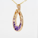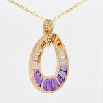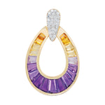 Turn heads with the striking elegance of the Doorknocker Ametrine Pendant. Crafted in a bold, open teardrop silhouette, this captivating piece showcases the natural beauty of ametrine, seamlessly blending rich purples with golden yellows in a radiant ombré effect. The gemstone is expertly set in a channel setting, highlighting its sleek lines and modern appeal, while the tapered baguette cut enhances its elongated brilliance and unique dual-tone charm. A pavé-accented top adds a hint of shimmer, elevating the overall design with just the right amount of sparkle. Effortlessly balancing bold design with everyday elegance, this pendant is a vibrant statement-maker for any occasion.