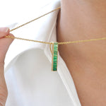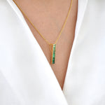Discover the refined brilliance of the 18K Gold Linear Tsavorite Pendant – a modern tribute to nature’s lush elegance. Featuring baguette-cut tsavorite gemstones in a sleek channel setting, it radiates rich green hues reminiscent of an evergreen forest. With its clean, minimalist silhouette, this pendant effortlessly complements both casual looks and formal ensembles. A fresh pop of color and timeless charm, it's more than an accessory – it’s a statement of natural beauty and contemporary style.