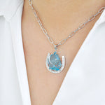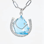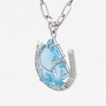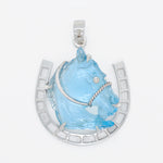 This exceptional 14 Karat White Gold pendant is a striking combination of artistic craftsmanship and timeless elegance, designed to captivate lovers of both fine jewelry and equestrian beauty. The centerpiece of this pendant is a hand-carved Swiss Blue Topaz gemstone weighing 13.23 carats, meticulously shaped to depict the lifelike details of a horse’s face. The vibrant, icy blue tones of the topaz add a sense of depth and vibrancy, while the intricate carving captures the spirit and grace of the horse. Encircling this masterpiece is a sleek white gold horseshoe, symbolizing luck and protection, beautifully framing the horse carving.
