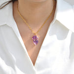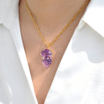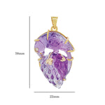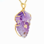 This elegant pendant, crafted in 14K yellow gold, features a beautifully hand-carved amethyst in the form of a parrot perched gracefully on a cluster of grapes. The rich violet hues of the amethyst highlight the intricate detailing, capturing the charm and vibrancy of nature. A true example of artistic craftsmanship, this pendant is perfect for those who appreciate unique, nature-inspired jewelry with timeless appeal.