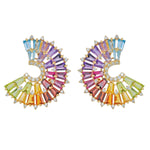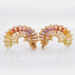 The Rainbow Orbit Diamond Earrings in 14K gold showcase a captivating spiral of prong-set Amethyst, Citrine, Rhodolite, Garnet, Blue Topaz, and Peridot gemstones, creating a mesmerizing gradient of vibrant colors. Sparkling diamond accents add extra brilliance and luxury, enhancing the earrings' elegant design. Perfect for making a bold statement or adding a touch of sophistication to any outfit, these earrings combine artistry and elegance in a truly radiant piece.
