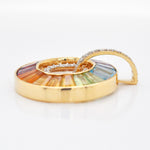 A masterpiece of elegance, this Circle Rainbow Pendant radiates timeless beauty with its exquisite blend of brilliant diamonds and vibrant gemstones. At its heart, a pavé-set diamond circle exudes luxury, symbolizing unity and eternity. Surrounding this luminous core, a mesmerizing array of tapered baguette-cut gemstones—including serene blue topaz, fiery citrine, lush peridot, deep rhodolite, and majestic amethyst—creates a stunning spectrum of color. Each gemstone is expertly channel-set, ensuring a seamless flow of brilliance. Suspended from a diamond-encrusted bail, this pendant is the perfect fusion of sophistication and playfulness, making it a radiant statement piece for any occasion.