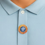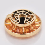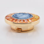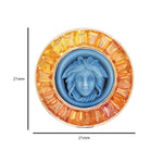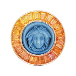 This bold 14k gold brooch features a central hand-carved blue Medusa cameo, symbolizing allure and power. The cameo is dramatically framed by a radiant 5.96-carat halo of fiery yellow and orange baguette-cut sapphires. Expertly crafted with precision, this sophisticated accessory merges ancient carving tradition with a striking contemporary design, making it a distinctive and powerful statement piece for collectors.