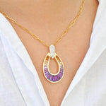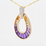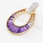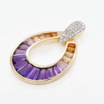 Turn heads with the striking elegance of the Doorknocker Ametrine Pendant. Crafted in a bold, open teardrop silhouette, this captivating piece showcases the natural beauty of ametrine, seamlessly blending rich purples with golden yellows in a radiant ombré effect. The gemstone is expertly set in a channel setting, highlighting its sleek lines and modern appeal, while the tapered baguette cut enhances its elongated brilliance and unique dual-tone charm. A pavé-accented top adds a hint of shimmer, elevating the overall design with just the right amount of sparkle. Effortlessly balancing bold design with everyday elegance, this pendant is a vibrant statement-maker for any occasion.