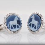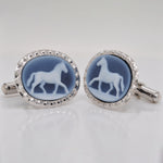 Elevate your formal attire with these exquisite Sterling Silver Horse Cufflinks, a perfect blend of equestrian grace and classic jewelry craftsmanship. Each cufflink features a meticulously detailed blue agate gemstone carved in a style reminiscent of traditional cameos. The deep, serene blue of the agate provides a striking high-contrast background for the crisp white silhouette of a horse in motion, capturing a sense of spirit and freedom. This oval gemstone is securely housed within a premium sterling silver setting, which has been finished with a sophisticated "diamond-cut" textured border. This intricate metalwork catches the light from every angle, adding a brilliant shimmer that frames the artwork and draws the eye to the cuff.