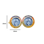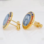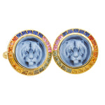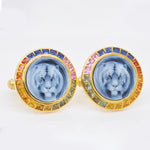 These striking 14 Karat Gold Multicolor Rainbow Sapphire Agate Tiger Cameo Cufflinks showcase exceptional craftsmanship and artistic gemstone work. At the center of each cufflink is a finely carved tiger cameo in natural agate, beautifully capturing the strength and majesty of the tiger with remarkable detail and depth. The cool blue tones of the agate create a captivating contrast against the warm glow of 14 karat yellow gold. Encircling the cameo is a vibrant arrangement of multicolor rainbow sapphires, precisely set in a gradient of rich blues, pinks, yellows, and oranges that add brilliance and character to the design. The combination of intricate carving and vivid gemstones creates a bold yet elegant statement. Designed with a sterling silver back mechanism, these cufflinks ensure durability, comfort, and secure wear.