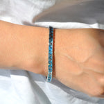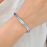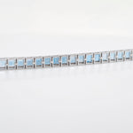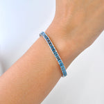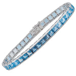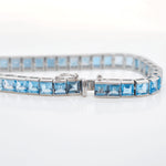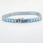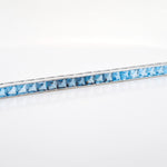 Make a statement of refined elegance with the 14K Gold Tennis Bracelet - Blue Topaz Square Edition. Featuring step-cut 4mm square blue topaz gemstones, this bracelet showcases a captivating spectrum of serene blues, channel-set for a sleek, seamless finish. The clean lines and symmetry reflect the timeless Art Deco style, while the secure lock mechanism ensures both comfort and confidence in wear. Crafted in lustrous 14K white gold, this bracelet is a modern classic—perfect for elevating your look with cool sophistication, from everyday moments to special occasions.