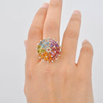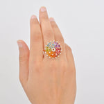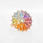 Bursting with color and brilliance, this Rainbow Orbit Diamond Ring is a celebration of bold design and exceptional craftsmanship. Featuring a mesmerizing spiral of vibrant tapered baguette gemstones, the ring comes to life with dazzling brilliant-cut natural diamonds. Each stone is expertly prong-set to highlight its vivid hue, creating a smooth gradient that flows effortlessly around the band. The sparkling diamond-studded setting and intricate diamond detailing throughout add an extra layer of luxury. Whether worn as a statement piece or stacked with matching rings, this ring is a radiant symbol of joy, color, and elegance.