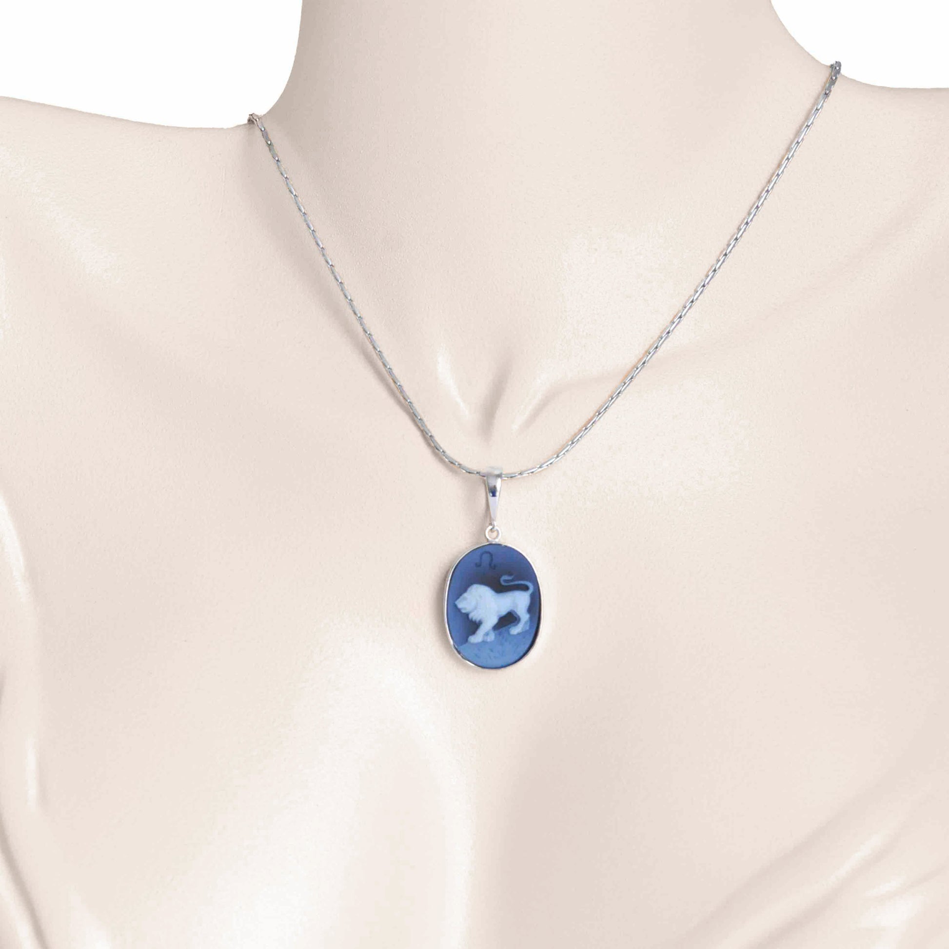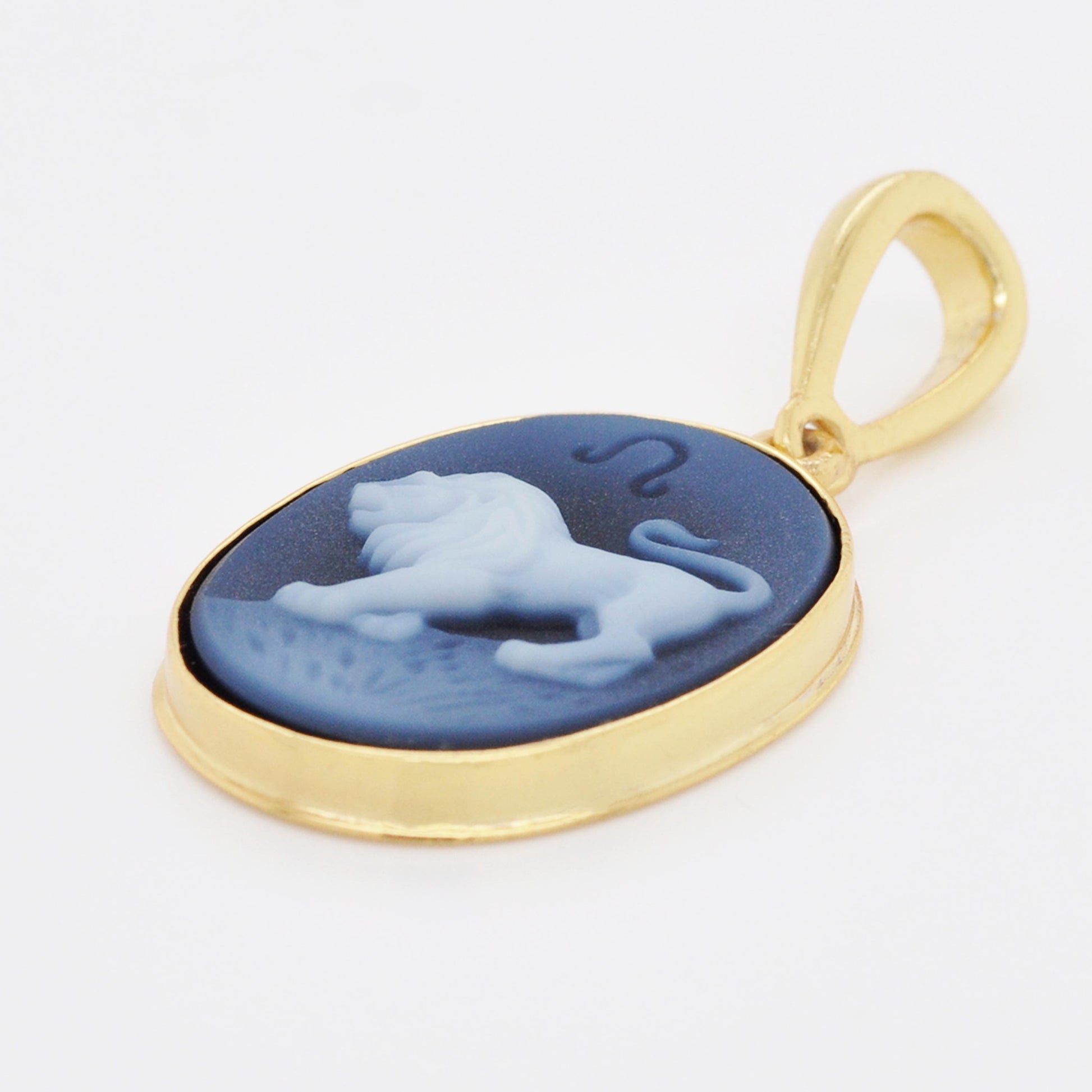 Diese Halskette mit Anhänger verfügt über eine atemberaubend geschnitzte Löwe-Sonnenzeichen-Kamee, die die Essenz und Eigenschaften des Sternzeichens in einem Metall Ihrer Wahl einfängt – Sterlingsilber, 14-karätiges Gold oder 18-karätiges Gold. Es ist ein atemberaubendes Schmuckstück, das exquisite Handwerkskunst, Eleganz und Personalisierung vereint . Mit seinem Design bietet es ein unverwechselbares Aussehen, mit dem Sie Ihr Sternzeichen Löwe oder ein anspruchsvolleres Golddesign zur Geltung bringen können. Der Anhänger ist in ein Metall Ihrer Wahl eingefasst und verfügt über eine handgeschnitzte Löwe-Sternzeichenkamee aus natürlichem Achat. Die Liebe zum Detail bei der Schnitzerei, die von einem erfahrenen deutschen Cameo-Künstler sorgfältig ausgeführt wurde, stellt sicher, dass jeder Aspekt des Löwe-Symbols perfekt dargestellt wird. Das Relief auf dem natürlichen Achat verleiht Tiefe und Textur und unterstreicht die Gesamtschönheit des Anhängers.