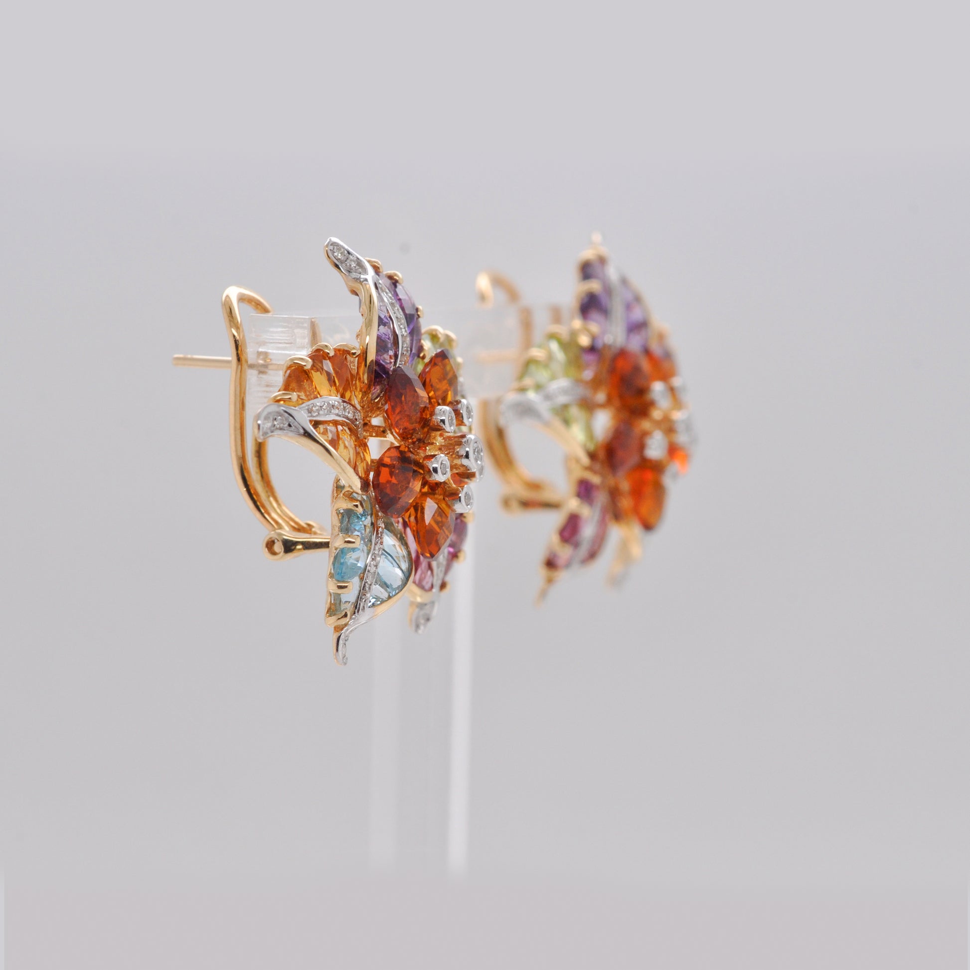 From our Couture Collection, these floral earrings are a study in color, balance and handcrafted finesse. Cast in 14K gold, each earring opens like a sculpted blossom, its petals set with Amethyst, Peridot, Blue Topaz, Rhodolite and Citrine that create a rich, painterly gradient. A brilliant diamond crowns the centre of each bloom, lending a quiet, enduring sparkle.