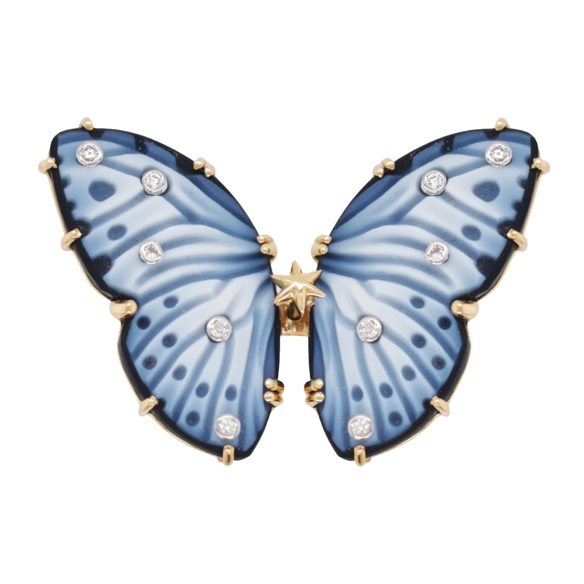 Celebrate artistry with this magnificent Hand-Carved Agate Butterfly Cocktail Ring. Crafted in 14K gold and accented with diamonds, this piece features an exquisitely detailed natural agate butterfly, making it a bold, unique statement jewel and a true collector's treasure.