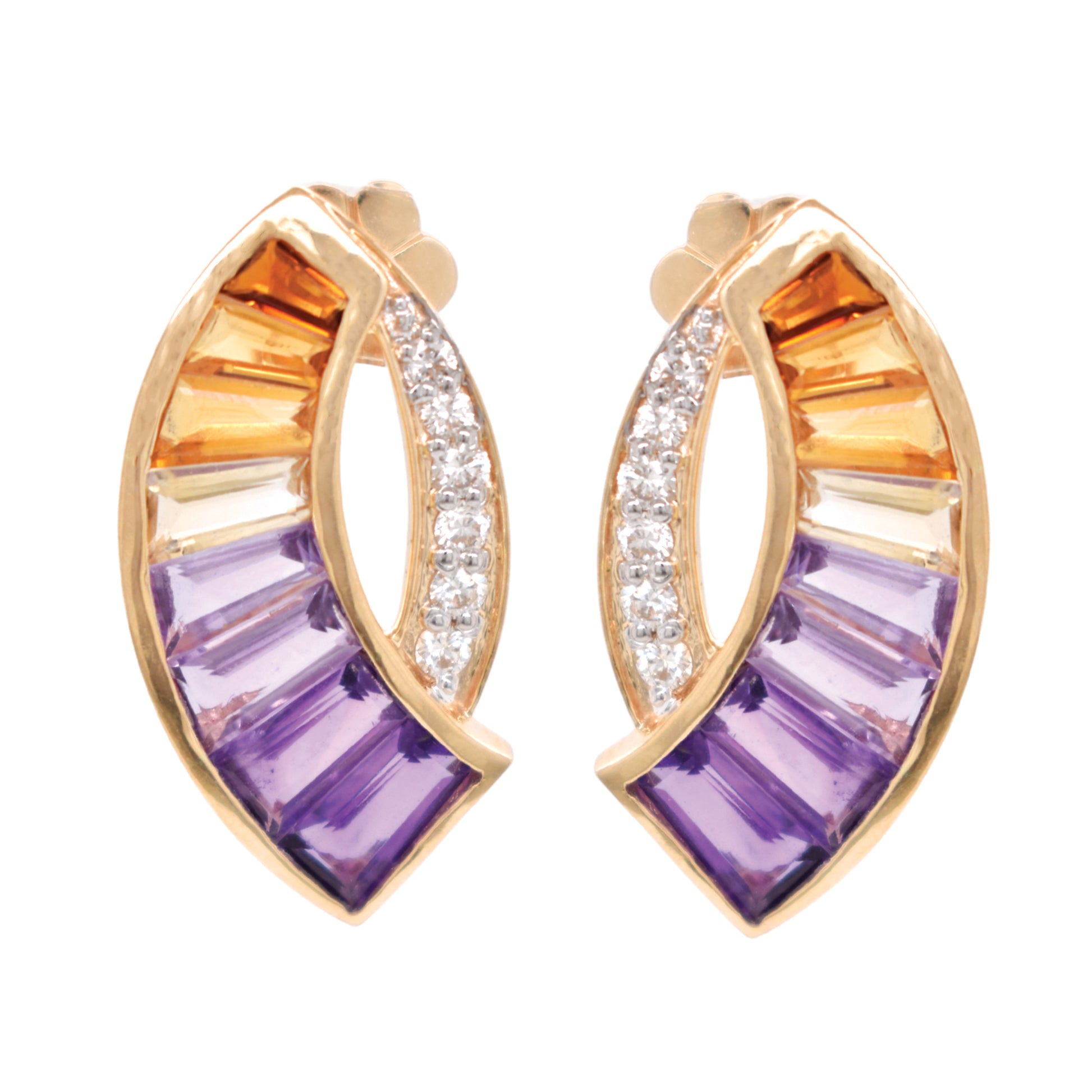 Sculptural and bold, these 14K gold “Sickle Sword” earrings show a flowing gradient from citrine to ametrine to amethyst, framed by pave diamonds—for striking elegance.