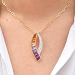 Radiant 14K yellow gold forms the canvas of this contemporary curved pendant, designed to trace the neckline with grace and movement. A hand‑picked gradient of tapered baguette amethyst and citrine gemstones shifts from soft lavender through rich violet to sunlit gold, invoking the rare allure of ametrine in vibrant contrast. The gemstones are channel‑set for seamless flow, while a delicate sweep of pavé‑set round diamonds adds sophisticated sparkle. This piece is more than jewelry—it’s a statement of artistry, color, and refined individuality.