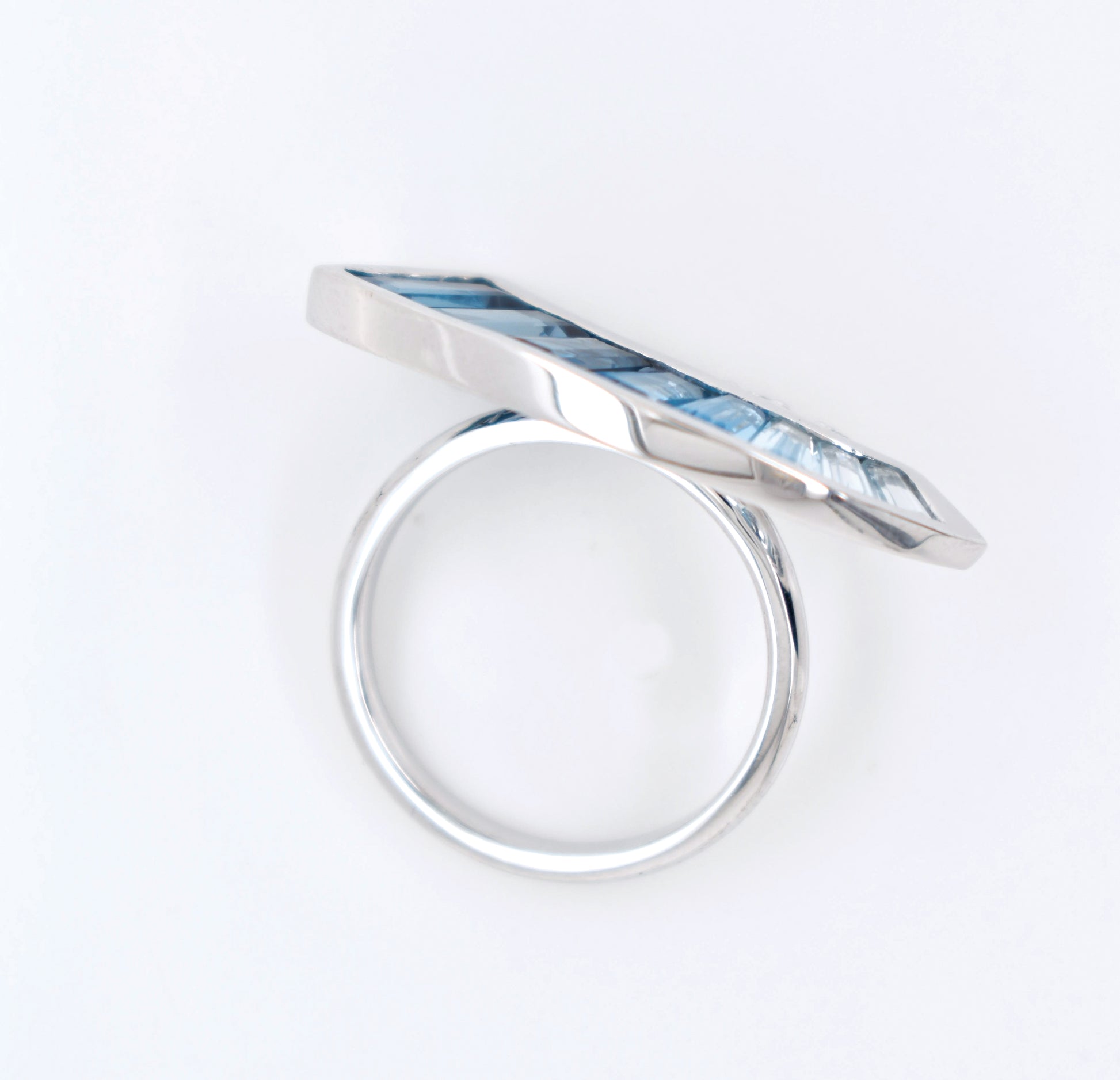 This sculptural 14K White Gold ring is a striking expression of contemporary elegance. It showcases a stunning arrangement of channel-set tapered baguette-cut blue topaz in a seamless gradient, flowing from pale sky blue to deep azure. The gracefully curved silhouette creates a dynamic wave of color, beautifully contrasted by a lower curve lined with radiant pavé-set white diamonds. This artistic, sickle-inspired design offers refined sparkle for a bold, modern look.