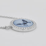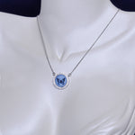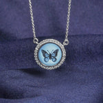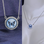 This stunning Butterfly Cameo Necklace is a delicate celebration of nature’s artistry, masterfully handcrafted in high-polish sterling silver. The centerpiece features a circular agate gemstone, precision-carved in a traditional cameo style to reveal a detailed butterfly with beautifully patterned wings. The ethereal blue and charcoal tones of the butterfly are set against a soft, sky-blue background, capturing a sense of light and movement.