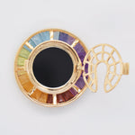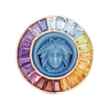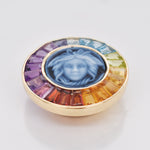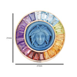 This 14k gold brooch is a work of art, centering on a hand-carved blue Medusa cameo, a symbol of strength and allure. It is framed by a radiant 6.48-carat halo of meticulously set, baguette-cut multicolor gemstones, creating a vibrant rainbow of amethyst, garnet, citrine, blue topaz, and peridot. Measuring 21mm, this striking accessory blends classical heritage with contemporary design, making it a bold and symbolic statement piece perfect for collectors.
