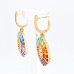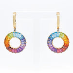 Elevate your look with these stunning 14K Gold Circle Prong Earring, showcasing a radiant circular motif adorned with a vibrant gradient of natural tapered baguette-cut gemstones. From deep purples to warm reds, the seamless rainbow arc captures the essence of harmony and creativity. A brilliant round diamond sits atop each circle, adding a refined sparkle to the colorful composition. These earrings are lightweight yet impactful—perfect for making a statement at any occasion.