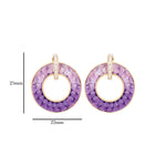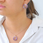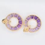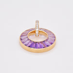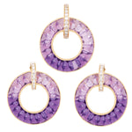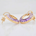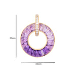 Unveiling the 14K Gold Circle Amethyst Set, a masterpiece of sophistication and craftsmanship. This enchanting set showcases tapered baguette-cut amethyst gemstones, elegantly arranged in a harmonious circular formation, radiating rich purple hues that exude elegance and grace. Each channel-set amethyst gemstone is meticulously placed to enhance the symmetry and vibrancy of the design, while a halo of pavé-set diamonds adds a celestial sparkle, elevating its brilliance. The pendant, gracefully suspended from a delicate chain, mirrors the refined charm of the matching earrings, creating a look that is both bold and timeless.