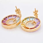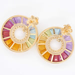 These exquisite 14K Gold Rainbow Channel-Set Diamond Earrings showcase a seamless circle of vibrant tapered baguette-cut gemstones, set in an elegant channel setting. Each gemstone—blue topaz, peridot, citrine, garnet, rhodolite, and amethyst—is meticulously arranged to create a captivating spectrum of color. At the heart of this masterpiece, a radiant inner circle of meticulously set diamonds enhances the brilliance of the design, adding a touch of refined luxury. The sparkling diamonds create a striking contrast against the colorful gemstones, elevating the earrings with an irresistible allure and timeless sophistication. This harmonious blend of vibrant hues and dazzling diamonds makes these earrings a true statement of elegance and artistry.
