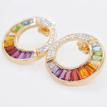 These 14K gold circular stud earrings radiate the brilliance of a rainbow, featuring a seamless arc of calibre-cut gemstones—aquamarine, blue topaz, peridot, green tourmaline, citrine, red garnet, rhodolite, and amethyst. Each tapered baguette-cut stone is masterfully channel-set using a precision silver mold, while pavé-set round diamonds add a touch of sparkle. With their graceful design and vibrant hues, these earrings are a luxurious statement of elegance and craftsmanship—perfect for any occasion.