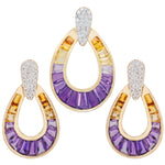 A stunning celebration of color and craftsmanship, this jewelry set brings together matching doorknocker-style earrings and a pendant designed to captivate. Each piece features a vibrant gradient of tapered baguette-cut amethysts and citrines, expertly channel-set within an elegant open teardrop silhouette of polished yellow gold. The rich transition creates a harmonious visual flow, symbolizing creativity, joy, and energy. Finished with dazzling pavé-set diamonds at the top, both the earrings and pendant shimmer with refined brilliance. Perfect for special occasions or everyday elegance, this set effortlessly blends bold color with timeless sophistication, making it an unforgettable addition to any jewelry collection.
