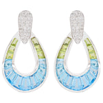 A celebration of vibrant color and fine craftsmanship, these doorknocker-style earrings showcase a stunning gradient of tapered baguette-cut blue topaz and peridot, symbolizing tranquility and vitality. Each gemstone is expertly channel-set within a polished yellow gold open teardrop frame, creating a seamless flow of cool blues and fresh greens. The design is topped with a brilliant pavé-set diamond accent, adding an elegant sparkle. Perfect for both day-to-evening wear, these earrings exude a fresh, modern sophistication while honoring classic luxury.