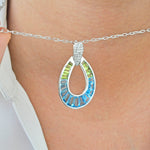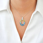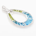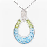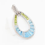 Bring a burst of color and elegance to your jewelry collection with this vibrant doorknocker-style pendant. Featuring tapered baguette-cut blue topaz and peridot stones expertly channel-set in white gold open teardrop silhouette, the pendant captures the refreshing beauty of clear skies and lush meadows. A pavé-set diamond accent at the top completes the design with a touch of luxurious brilliance. Versatile and eye-catching, this pendant is perfect for adding a pop of color and refined glamour to any outfit, from casual chic to evening elegance.