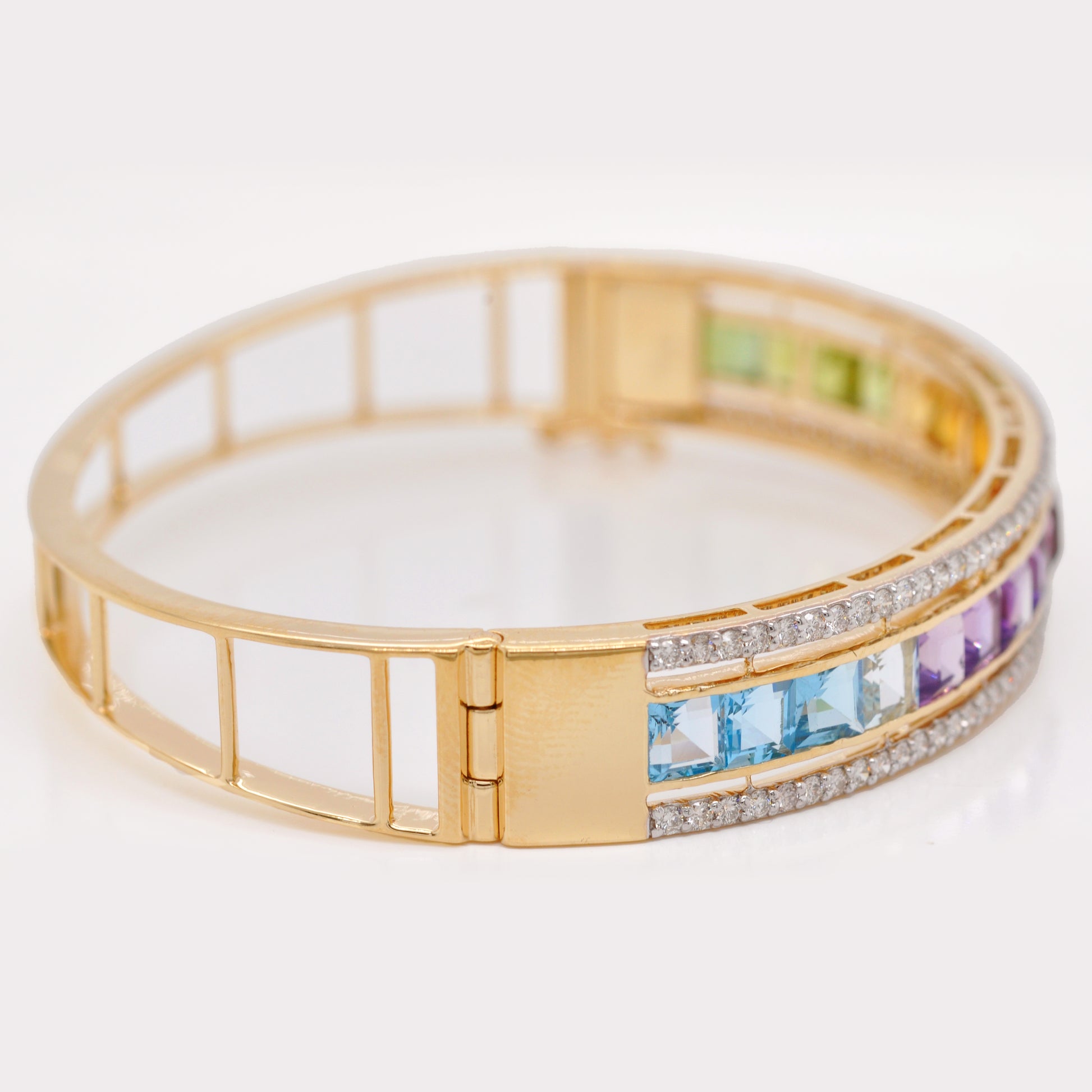 Elevate your everyday elegance with the 18K Gold Rainbow Cuff Diamond Bracelet, a celebration of color, craftsmanship, and luxurious design. This striking bracelet showcases a row of square-cut Blue Topaz, Peridot, Citrine, Garnet, Rhodolite, and Amethyst gemstones—each handpicked for its brilliance and vibrant hue. Arranged in a precise channel setting, the stones form a seamless rainbow that captures the joy and individuality of self-expression. Framing this dazzling spectrum, brilliant-cut diamonds are meticulously set on both sides, adding luminous contrast and enhancing the bracelet’s luxurious appeal. Crafted in rich 18K gold, the stiff, open-cuff design maintains its structured elegance while offering a comfortable and secure fit.
