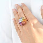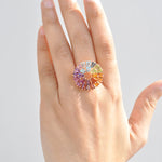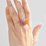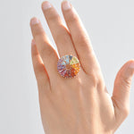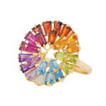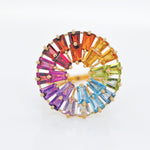 Dazzle in color with this 14K Gold Rainbow Orbit Ring. Featuring 24 tapered baguette-cut gemstones—amethyst, citrine, rhodolite, garnet, blue topaz, and peridot—each prong-set to maximize brilliance. The inner layer holds 8 stones, while the outer layer features 16, all arranged in a vibrant three-quarter-circle design. Bold yet refined, this ring is a radiant celebration of color and elegance.
