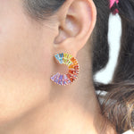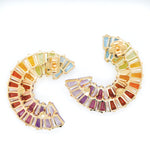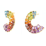 Add a vibrant touch to your collection with the Rainbow Orbit Set, featuring a matching pendant and earrings in 14K yellow gold. This radiant set showcases tapered baguette-cut gemstones—Blue Topaz, Peridot, Citrine, Garnet, Rhodolite, and Amethyst—expertly prong-set in a double-layer rainbow design. The pendant holds 32 gems (12 inner, 20 outer), while the earrings shimmer with 48 gems (9 inner, 15 outer). Light flows through each stone, enhancing their natural brilliance. A perfect blend of color and elegance for any occasion.