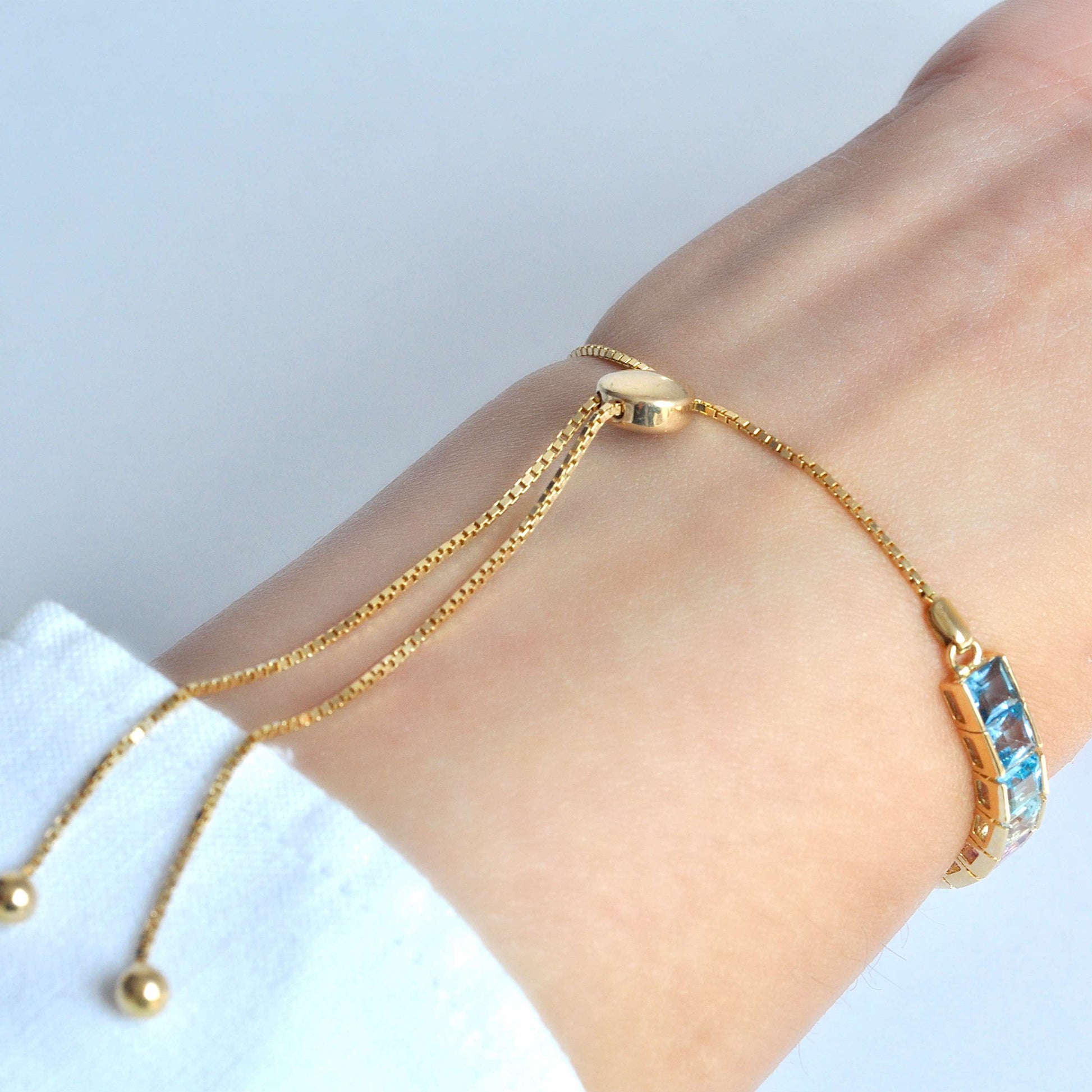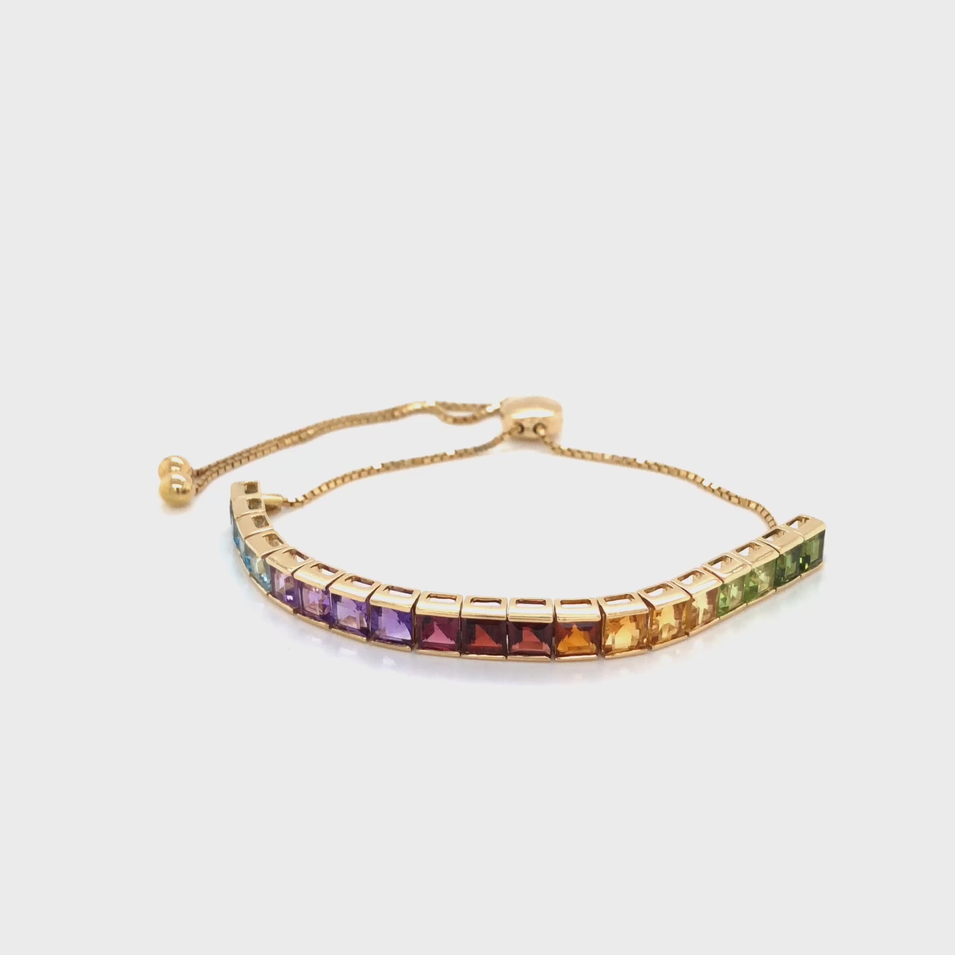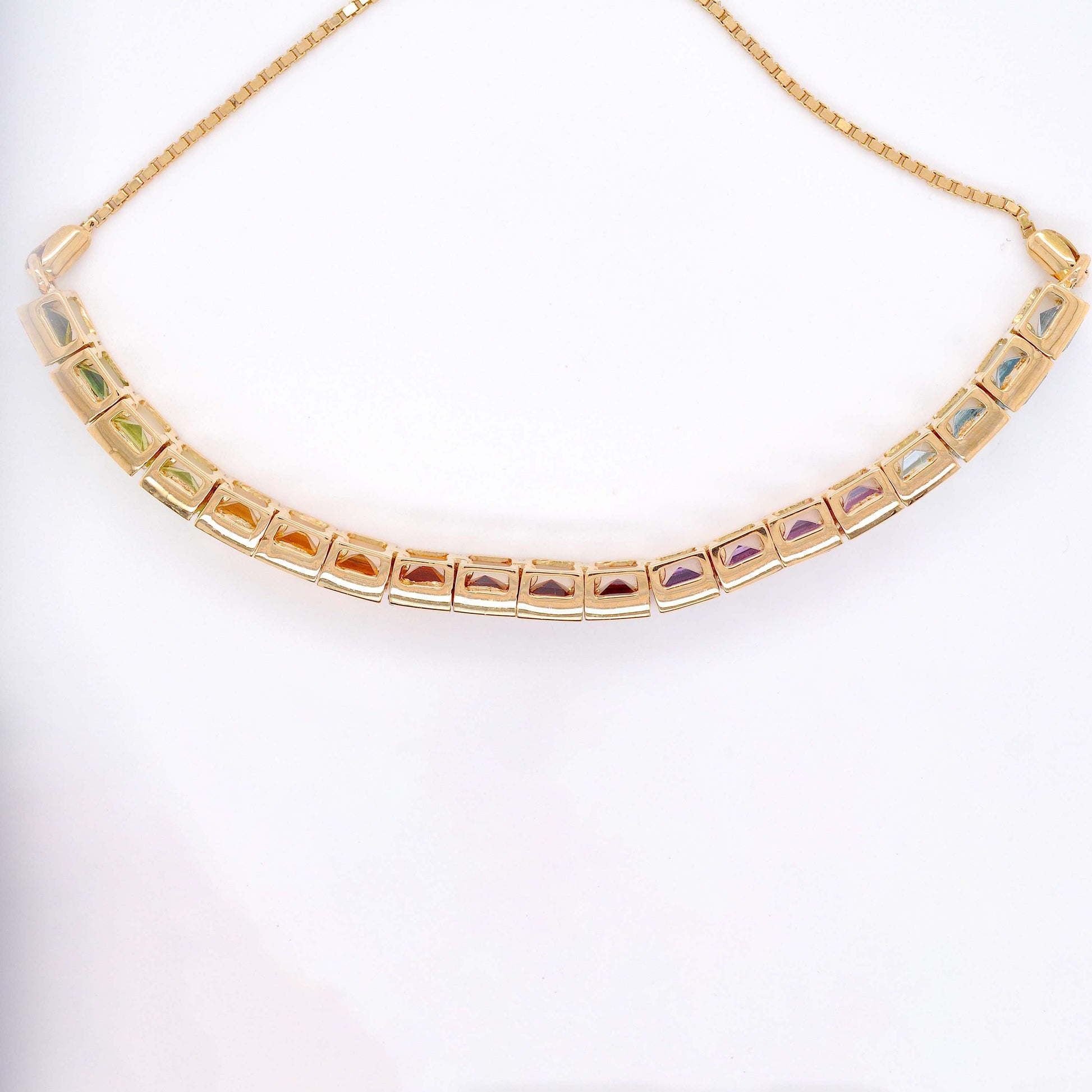 Add a bold splash of color to your wrist with the 18K Gold Rainbow Tennis Bolo Bracelet—a refined fusion of elegance, vibrancy, and adaptability. This captivating bracelet showcases a half-band of square-cut natural gemstones including Blue Topaz, Amethyst, Citrine, Rhodolite, Garnet, and Peridot, each chosen for its vivid hue and brilliance. Meticulously channel-set in gleaming 18K yellow gold, the gemstones create a sleek, continuous ribbon of color that catches the light with every movement. The other half features an adjustable bolo chain, also crafted from 18K gold, allowing for a customized and comfortable fit that suits any wrist.